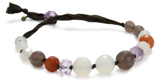 The down-to-earth tones of the Wasabi by Jill Pearson "Hara" Purple Sunset Bracelet are cool and subtle for everyday wear. Strung on a chocolate brown silk ribbon, the bracelet features round beads of white and gray onyx, red aventurine, and cap amethyst. Plus, a small jade "wasabi" bead accents the bracelet with Jill Pearson's signature stamp. The wooden bead near the knot slides so the bracelet